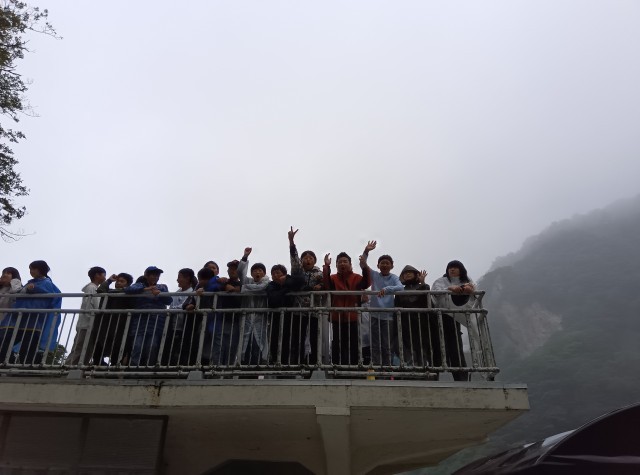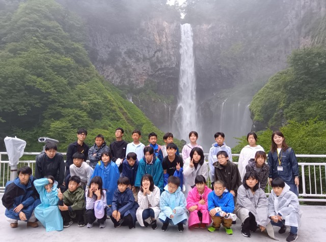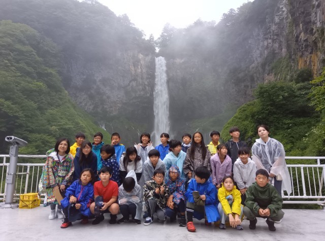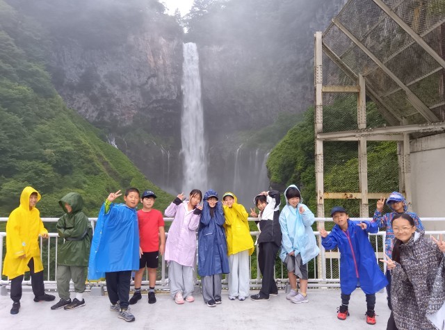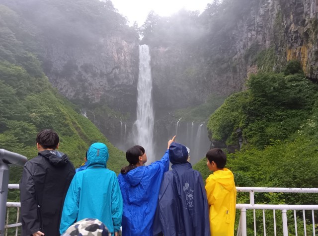 華厳の滝です。集合写真撮影なのですが、迫力ある瀑布に目を奪われてしまっていました。