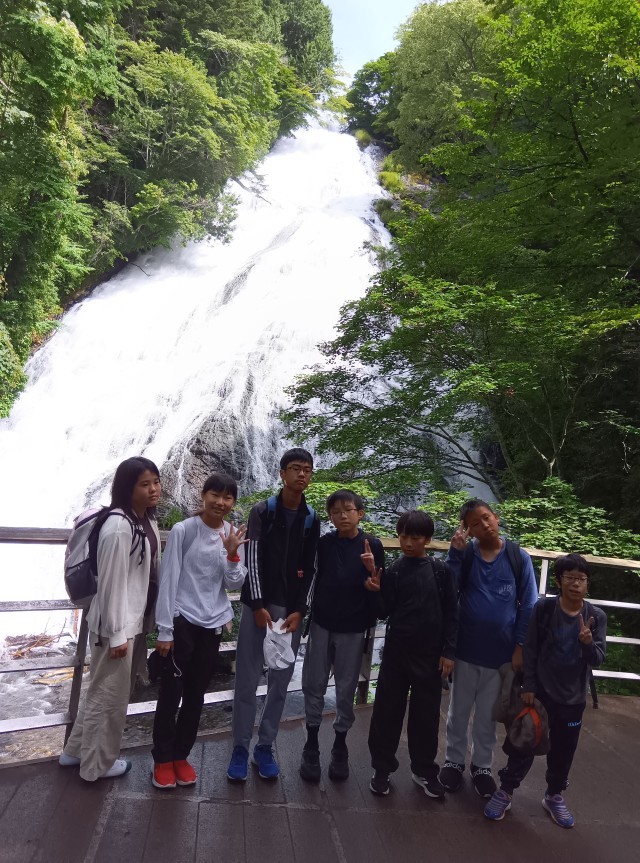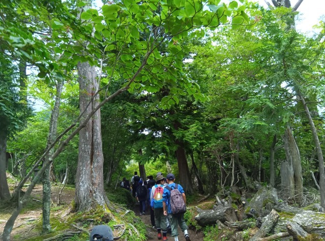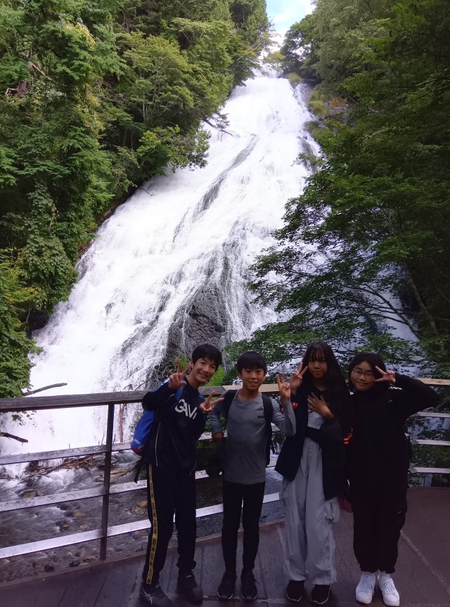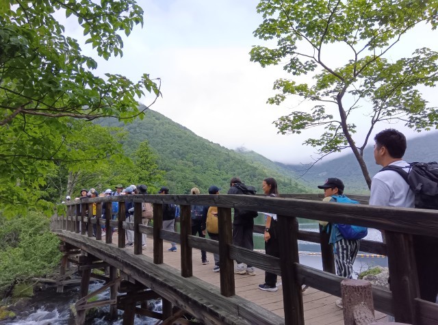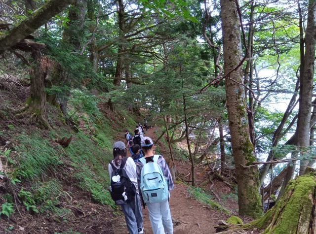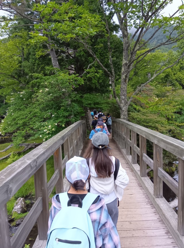いよいよハイキングのスタートです。湯滝を背にグループ集合写真を撮ったら、まずは、湯滝の横を上り、湯ノ湖へ行きましました。そして、湯ノ湖を半周歩きました。硫黄の匂いを感じたり、澄んだ湯ノ湖に大きな魚を見つけたりしながら、小さなアップダウンの道のりを元気に歩きました。
