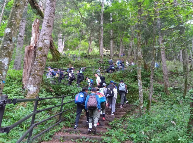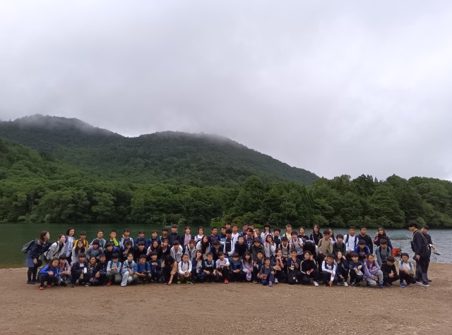 ゴールの湯ノ湖畔では全員集合写真の撮影をしました。卒業アルバムの見開きページの予定だそうです。疲れを見せず、笑顔いっぱいでした。