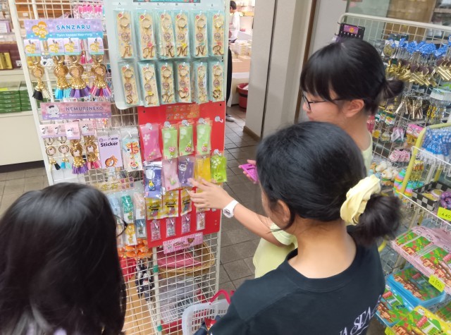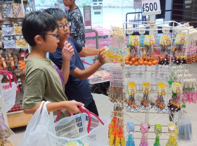 みんなが楽しみにしていたことの1つ、お土産タイムです。自分に、家族に、商品を手にし、じっくり吟味していました。