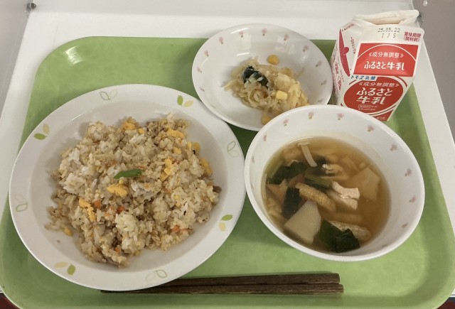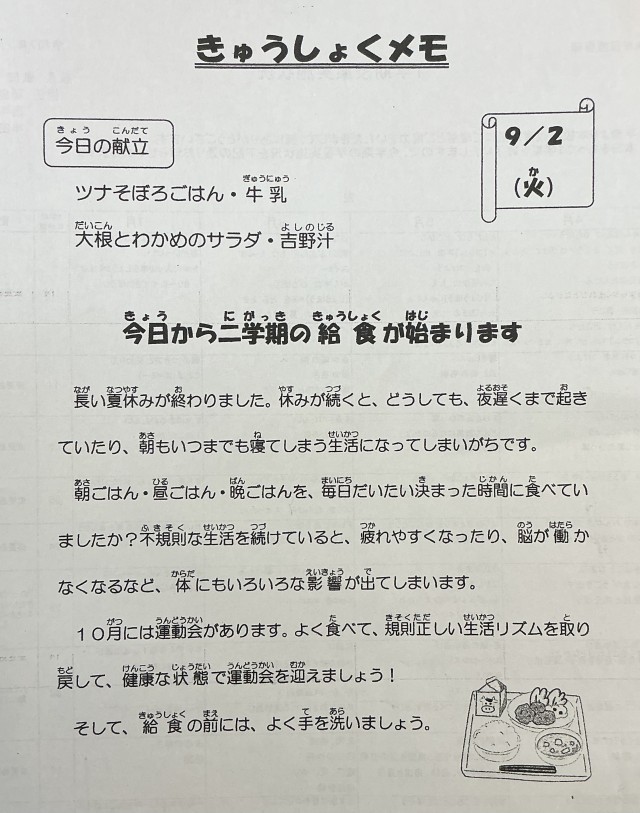 【今日の献立】ツナそぼろごはん・牛乳・大根とわかめのサラダ・吉野汁