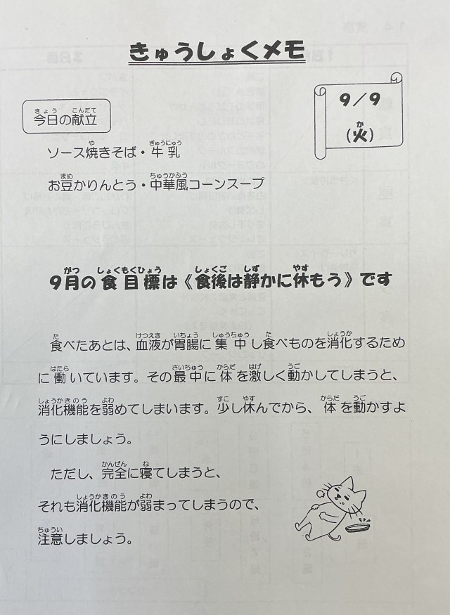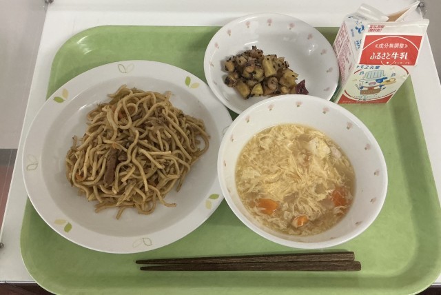【今日の献立】ソース焼きそば・牛乳・お豆かりんとう・中華風コーンスープ