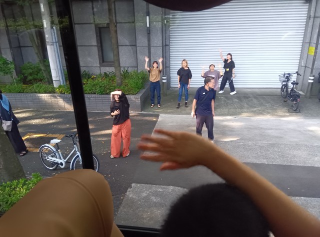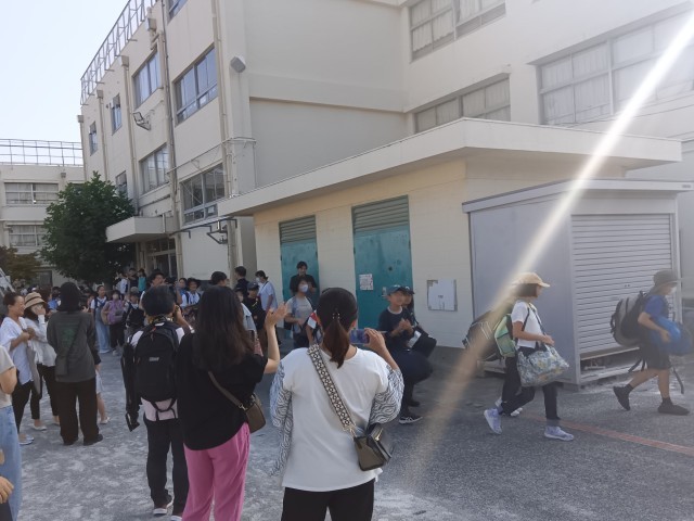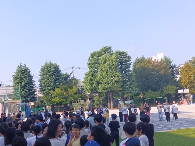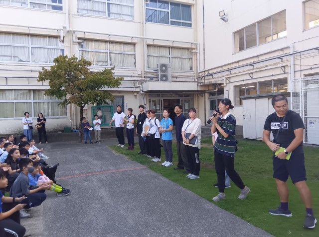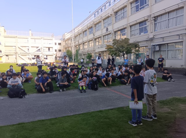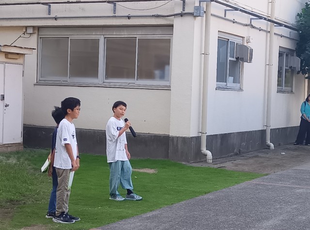 集合し、出発式です。司会の2人の進行で、児童代表の言葉や、引率の先生たちを紹介などがあり、お見送りのみなさんに「行ってきます」と元気に挨拶しました。