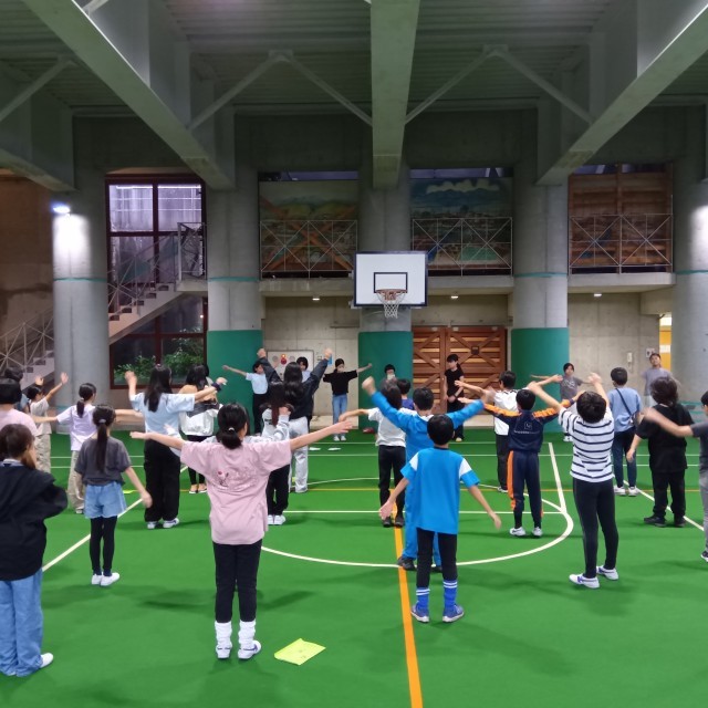 ラジオ体操で頭と体を目覚めさせました。