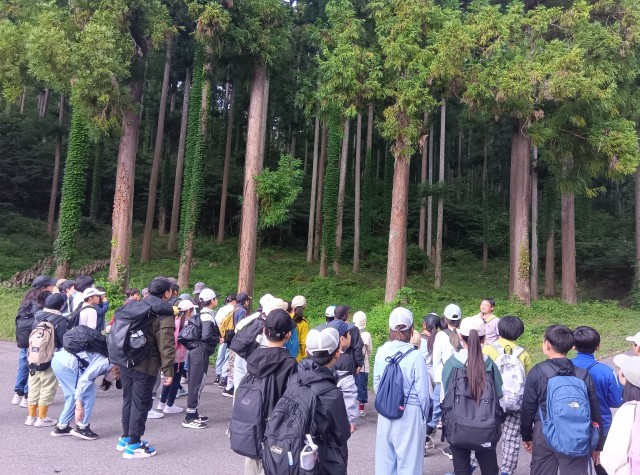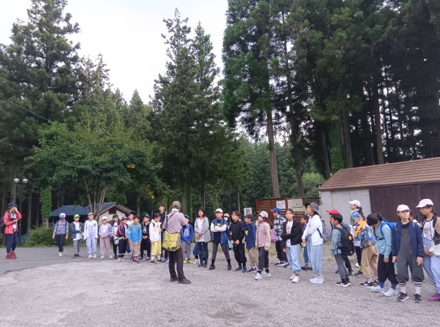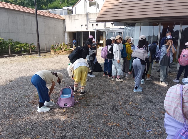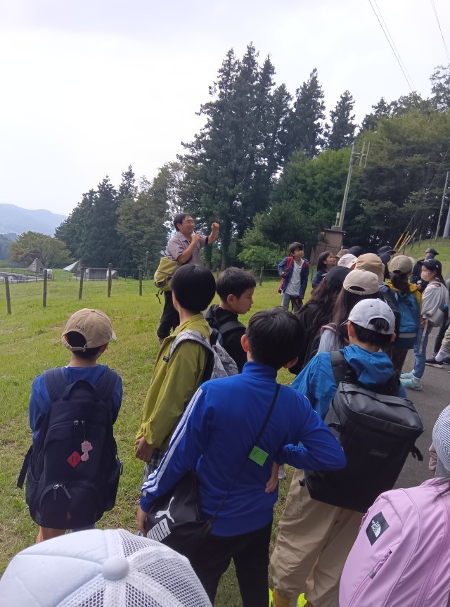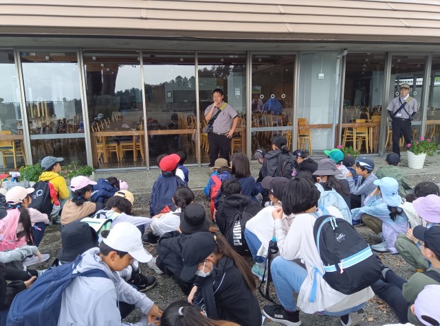 こちらは里山入門です。避難訓練後に行いました。学年を2つに分け、お二人のガイドさんからお話を伺います。
