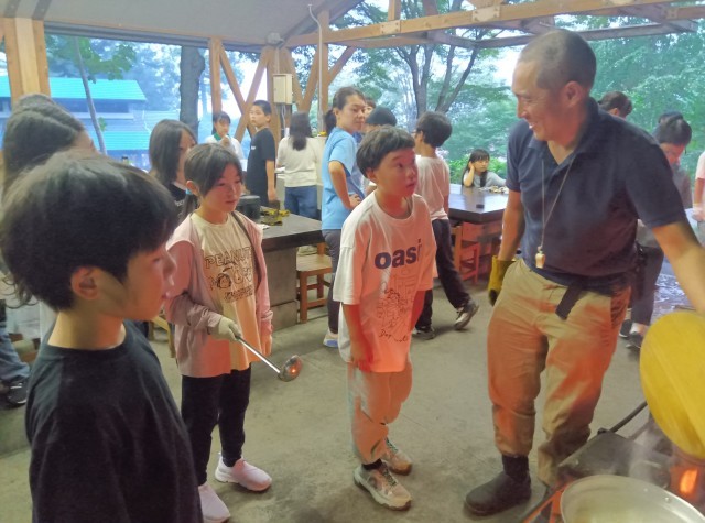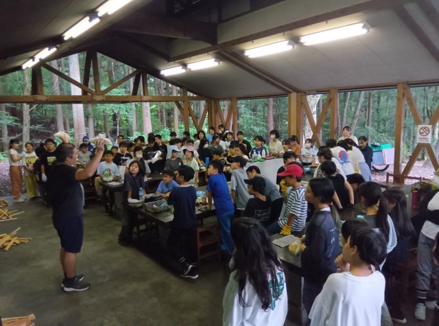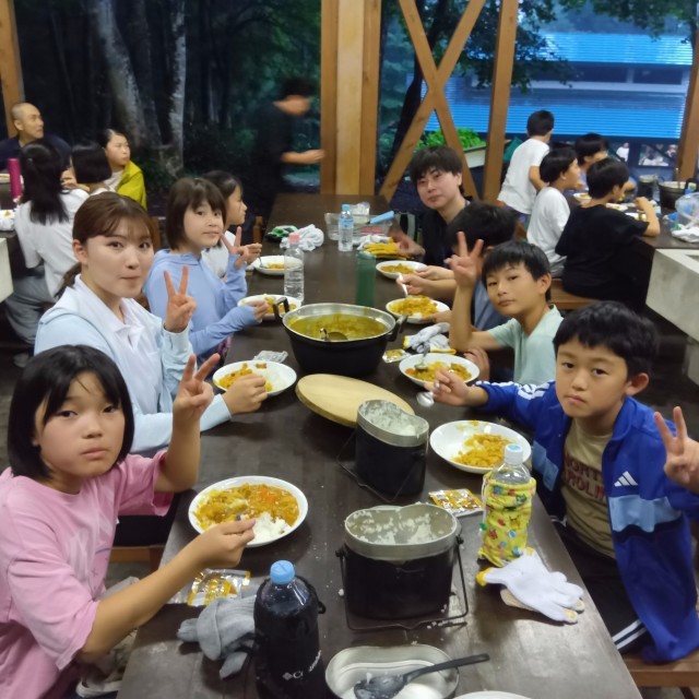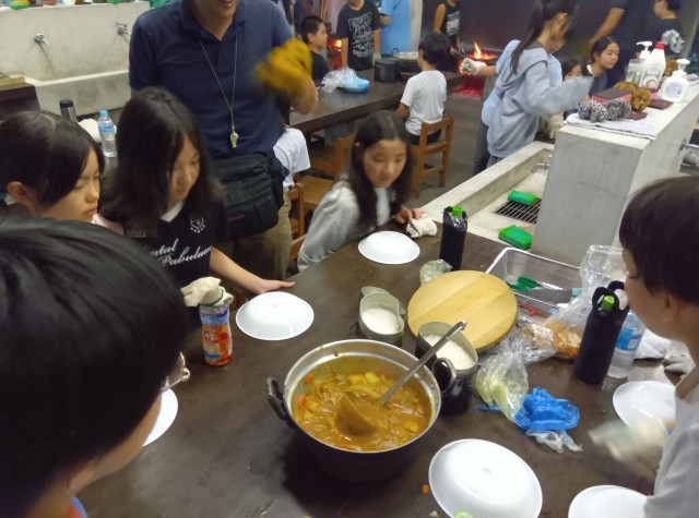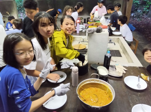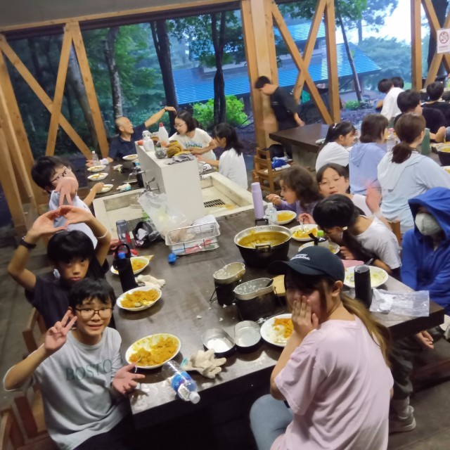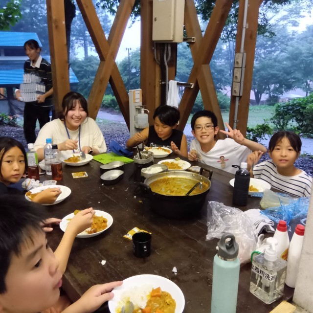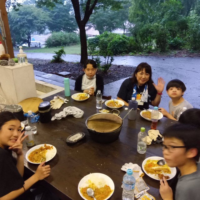 作っている途中から雷が鳴り始め、食べ始めると雷がどんどん大きくなったので、食べ終わったところでスタッフの方が迎えに来て、片付けはせず、急ぎ宿舎に入りました。移動が最後の方の子は少し濡れてしまいましたが、その後強烈な大雨になったので、あのタイミングで移動できて本当に良かったです。