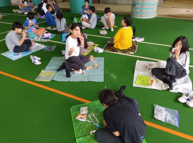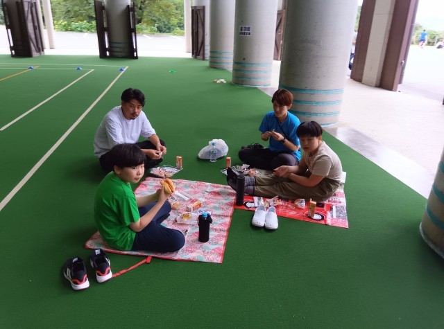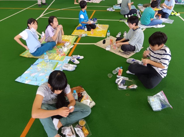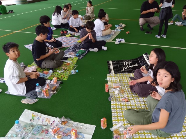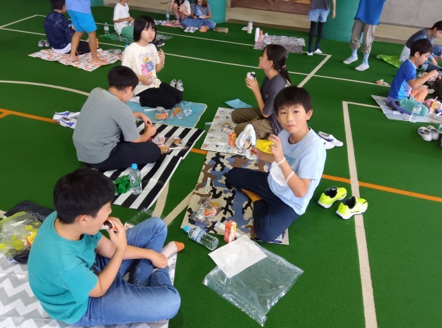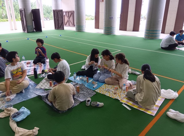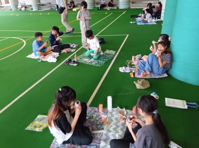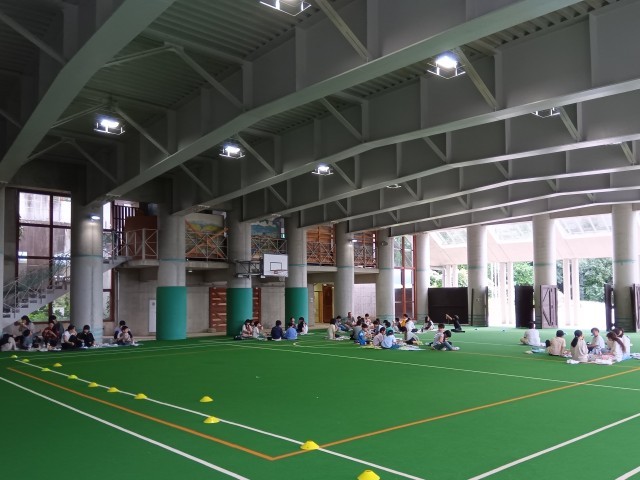 屋根付き広場の扉をすべて開け、中でも外でもいいことにしました。大体、半々といったところでしょうか。