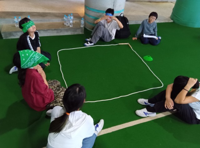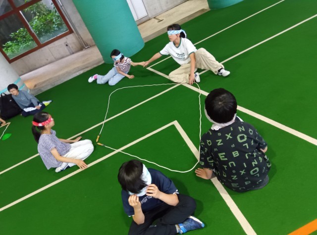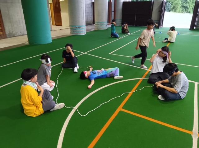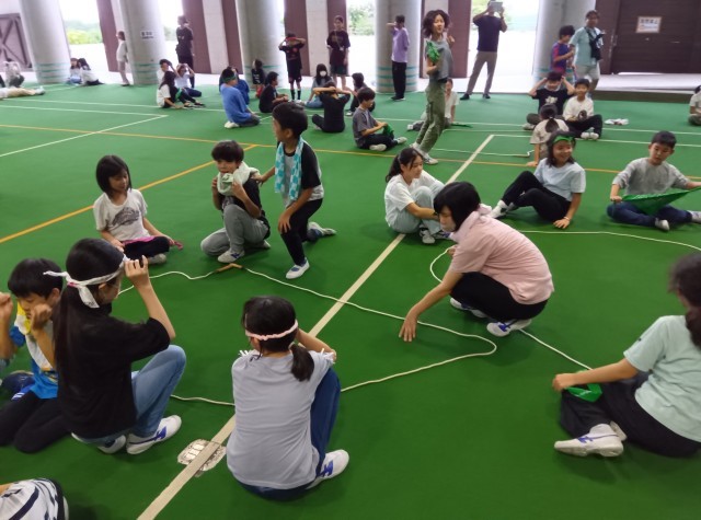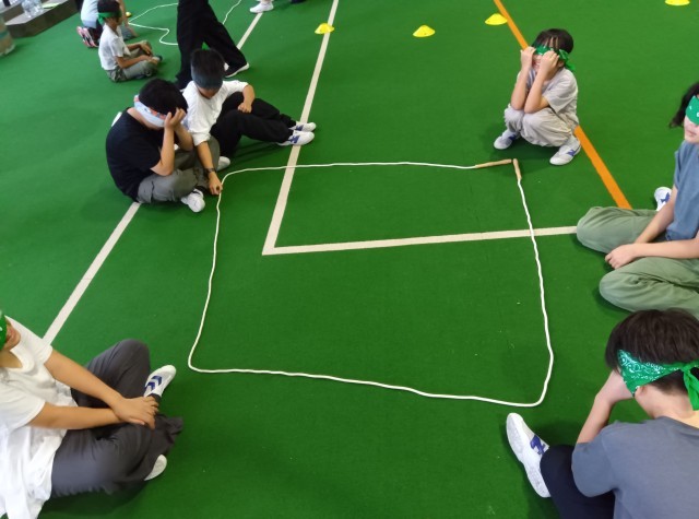目隠しをした状態で、長縄で正方形を作るというものです。非常にシンプルだけれど、頭脳を使うゲームでした。多くの班が、形を作るのに苦戦する中、2チームがとても綺麗な正方形を作っていました。