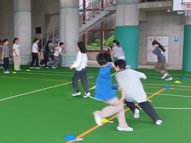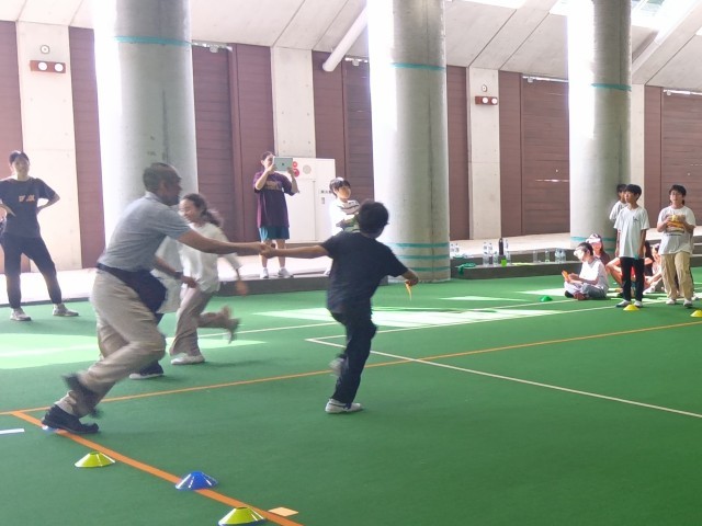 3回戦は、新聞紙運びです。体の前面に付け、勢いよく走り、落とさないように進みます。(こちら写真なし)