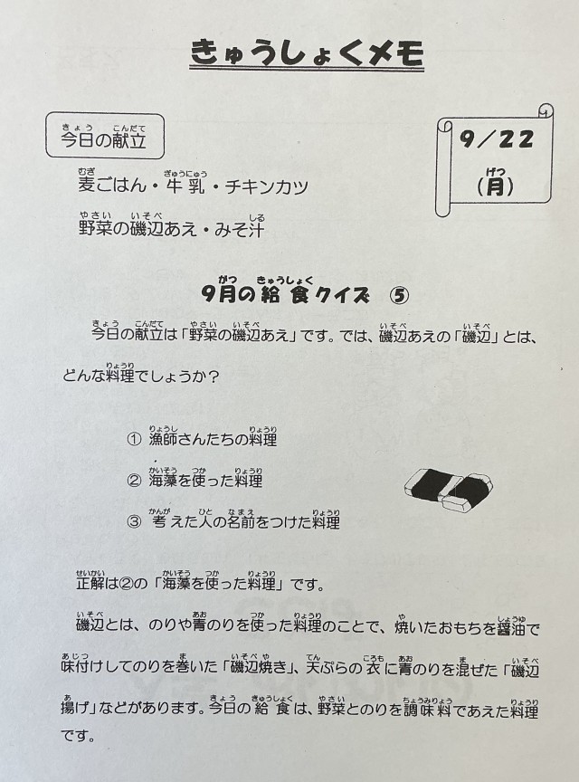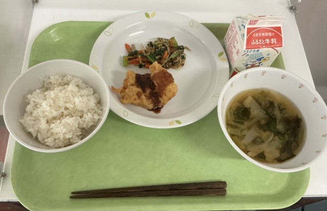 【今日の献立】麦ごはん・牛乳・チキンカツ・野菜の磯辺あえ・みそ汁