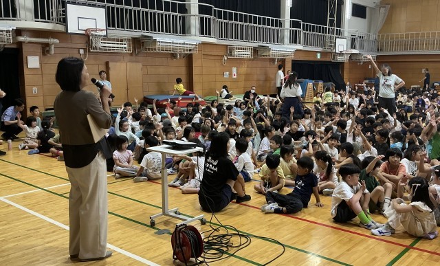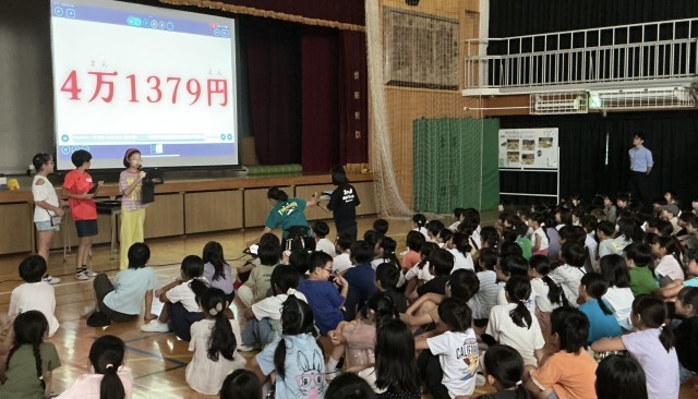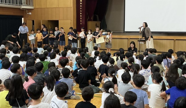 学校長は「あいさつ」についてお話し、子どもたちは隣の子と元気よくあいさつを実践してみました。次に代表委員の児童が、ユニセフ募金の集計金額について報告しました。最後に空手、剣道、チアクラブ、野球などで活躍した児童の表彰を行いました。