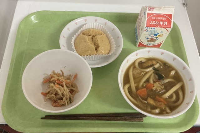 【今日の献立】カレーうどん・牛乳・ごま酢あえ・栗入り黒糖蒸しパン