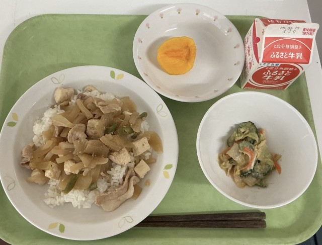 【今日の献立】豚丼・牛乳・野菜のごまみそあえ・くだもの(柿)