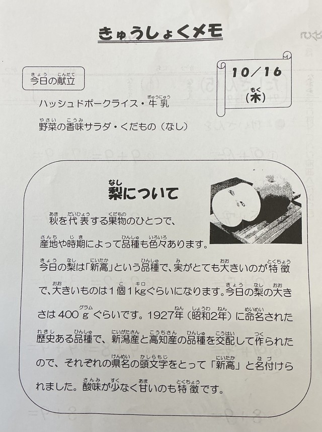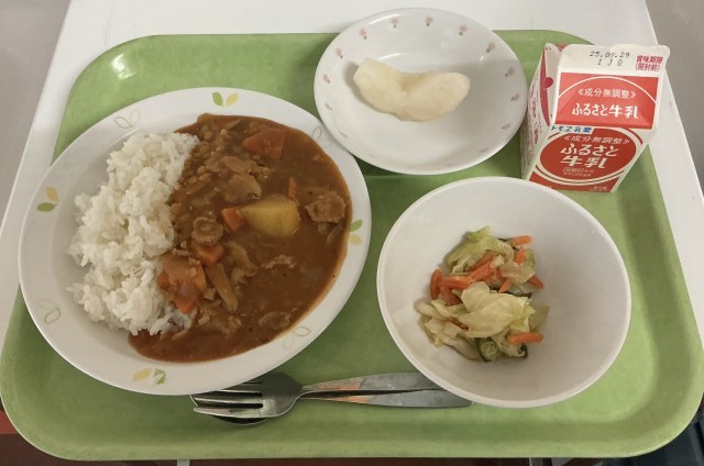 【今日の献立】ハッシュドポークライス・牛乳・野菜の香味サラダ・くだもの(なし)