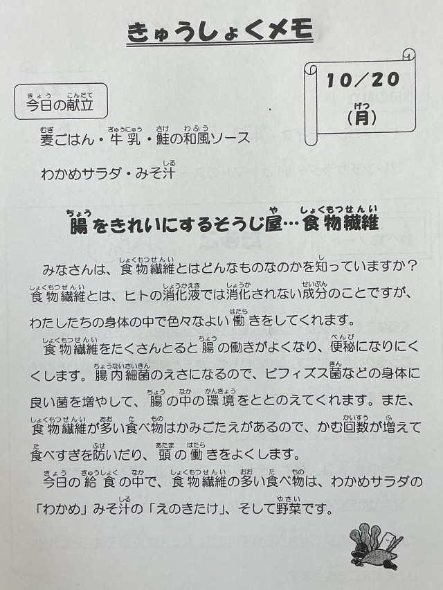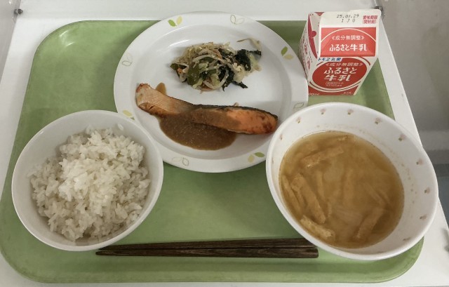 【今日の献立】麦ごはん・牛乳・鮭の和風ソース・わかめサラダ・みそ汁