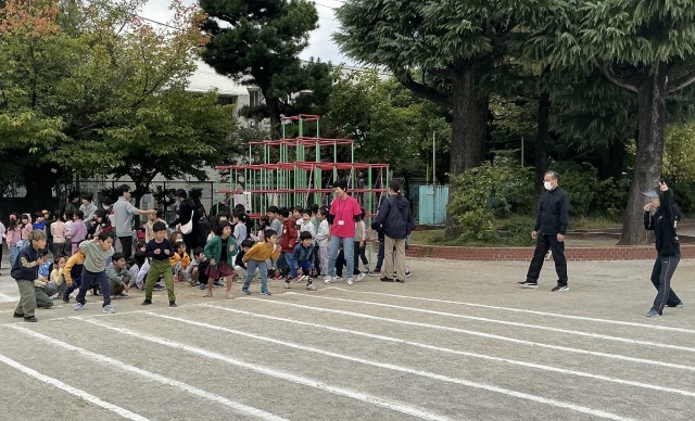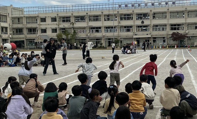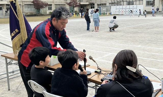 6年生のアナウンス係がレースの実況放送をして盛り上げていました。