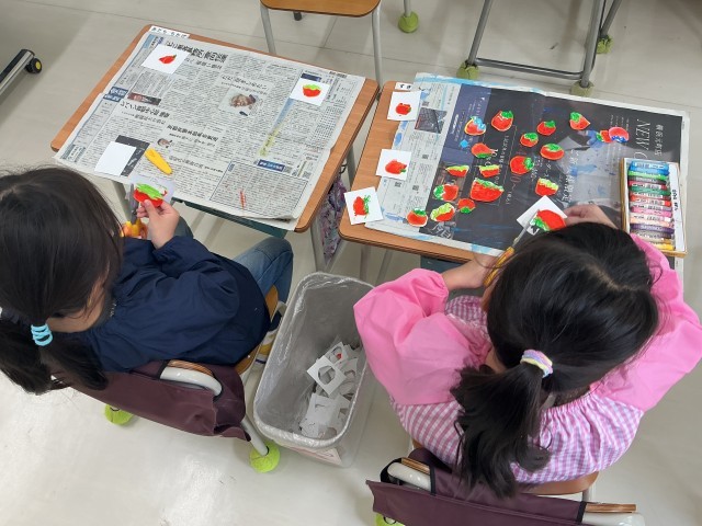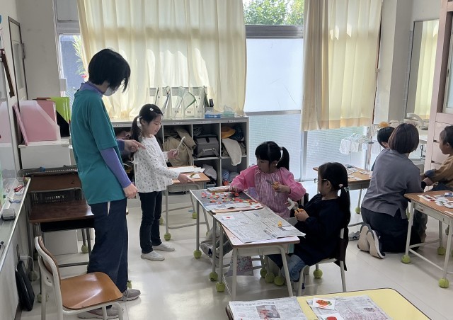 クレパスと絵の具で描いた柿を、ハサミを器用に使って切り抜きました。