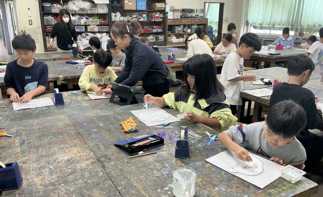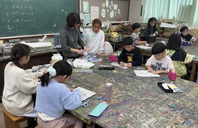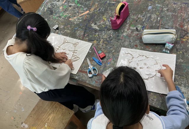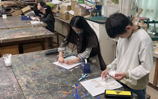表したい「ヒカリ・スケルトン」のイメージをもって、ひもで形をつくりました。形をつくった中にボンド液を入れていきました。