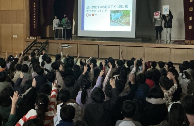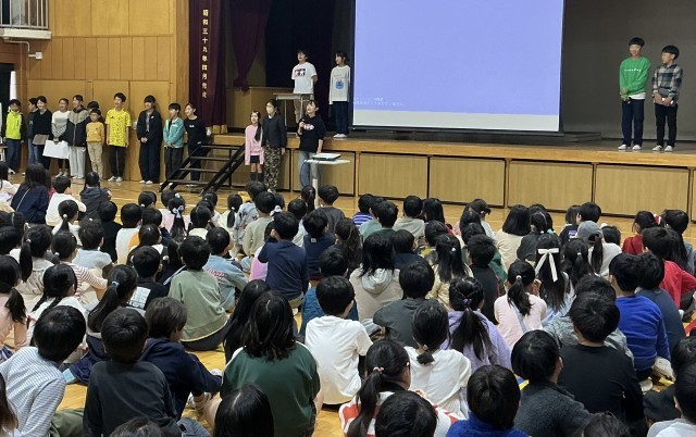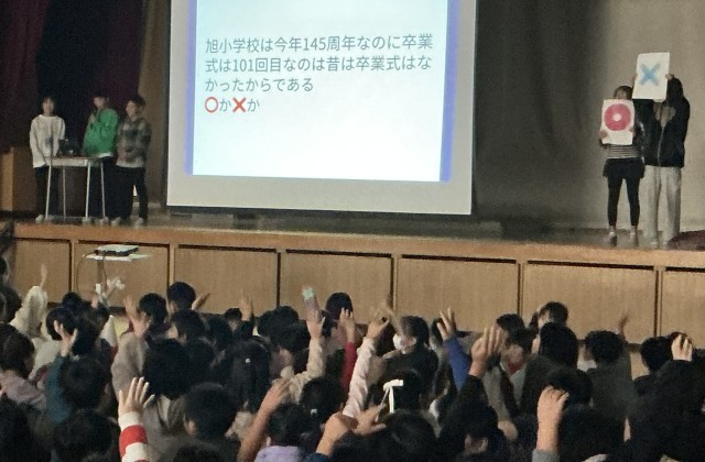 児童集会 公開日 2025/11/04 更新日 2025/11/04 今日のできごと 集会委員会の児童が、旭小学校開校145周年に関するクイズを出題しました。子どもたちは○×クイズで、正解すると大喜びでした。
