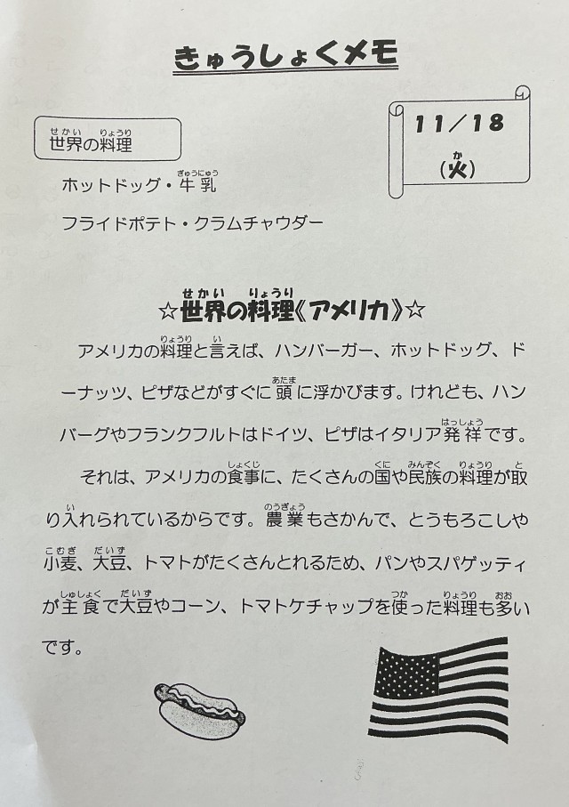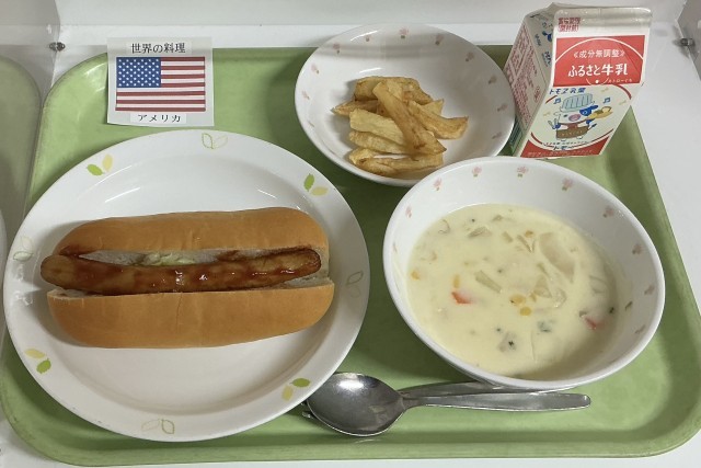 【今日の献立】ホットドッグ・牛乳・フライドポテト・クラムチャウダー