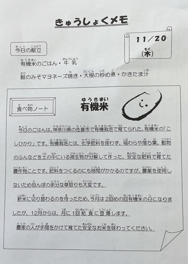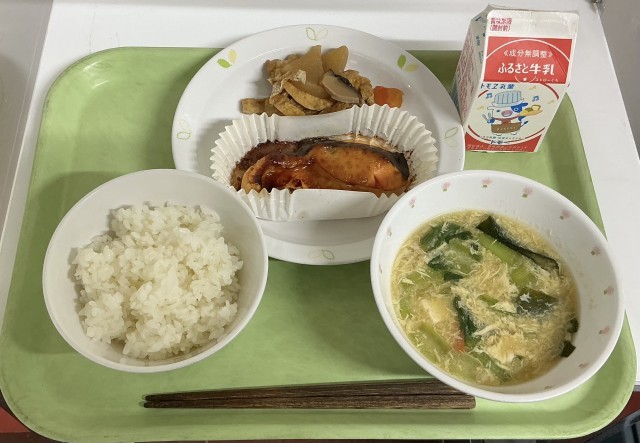 【今日の献立】有機米のごはん・牛乳・鮭のみそマヨネーズ焼き・大根の炒め煮・かきたま汁