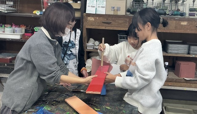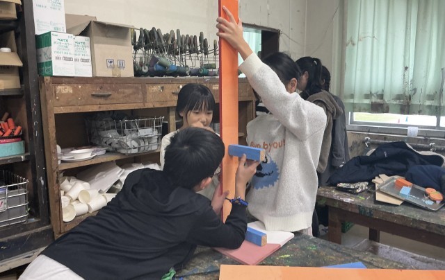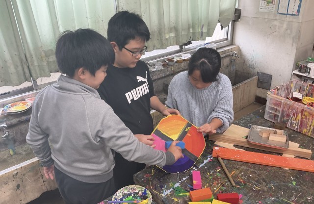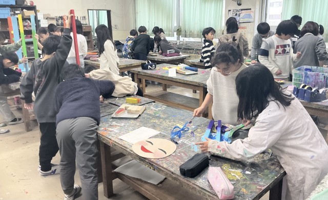 共同作品「ウエルカムさん」に取り組んでいます。友達と協力して楽しそうに作業を進めていました。