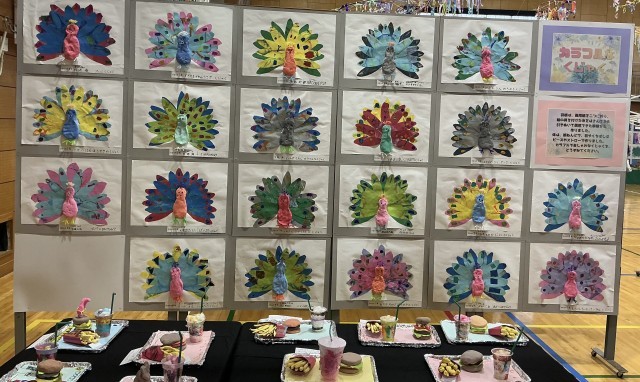 【展覧会5】ひまらや学級 カラフルなくじゃく 公開日 2025/11/30 更新日 2025/11/30 今日のできごと 羽根は、画用紙を二つに折り、絵の具を付けた糸をはさんでから引き抜いて偶然できた模様から作りました。体は、紙ねんどで、目や口ばしはビーズやストローで作りました。