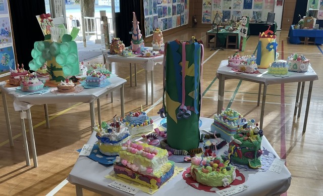 【展覧会9】2年生 こもれび学級1組 公開日 2025/11/30 更新日 2025/11/30 今日のできごと 『ハッピバースデイ145』旭小学校145歳のお誕生日をお祝いするケーキを、絵の具で色を付けた紙粘土で作りました。フルーツやホイップクリーム、クッキーなどをトッピングしました。思わず食べたくなるようなおいしそうなケーキが出来上がりました。旭小 おめでとう!