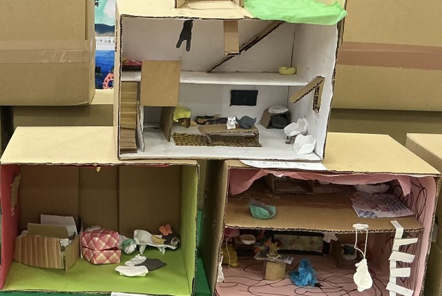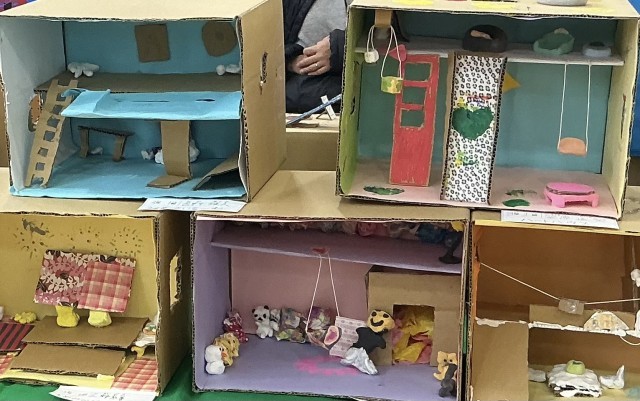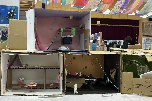 【展覧会14】3年生『ゆめのマイルーム』 公開日 2025/12/01 更新日 2025/12/01 今日のできごと 自分だけの夢のお部屋があったら・・・そんな願いを箱の中に詰め込みました。ダンボールや色画用紙、紙粘土などの使い方を考えたり工夫したりしながら、お部屋の中にあったらいいなと思うものをつくりました。