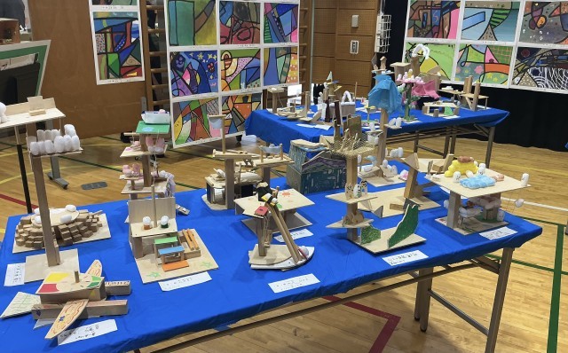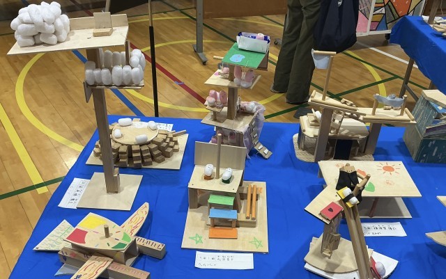 【展覧会24】 5年生『ウッディアートアートスポット』 公開日 2025/12/01 更新日 2025/12/01 今日のできごと 電動のこぎり木材をいろいろな形に切ったり組み立てたりして、ウッディ(木の)アートなスポット(場所)をつくりました。アイデアや工夫がいっぱいのアートあふれる場所ができました。 +1