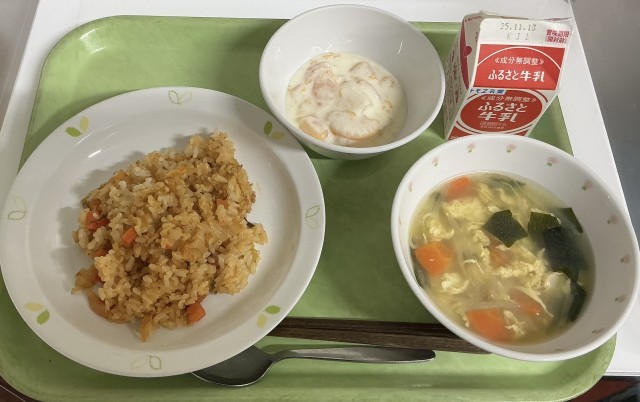 【今日の献立】キムチチャーハン・牛乳・トックスープ・フルーツヨーグルト