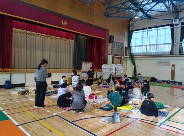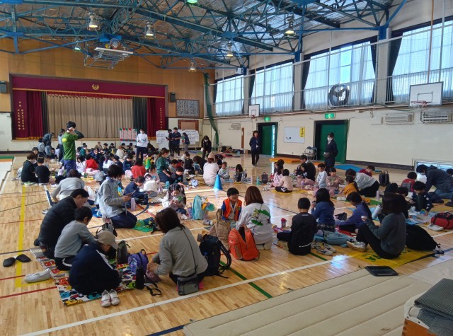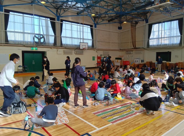 低学年、中学年、高学年を基本に、3つに分かれて食べました。他の学校の友達とレジャーシートを敷いて食べる子もいました。楽しい交流の時間になりました。