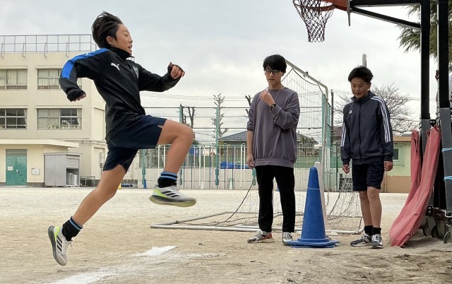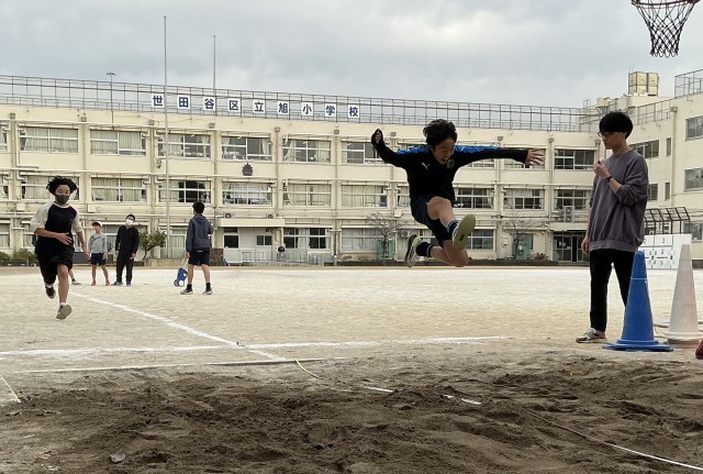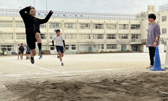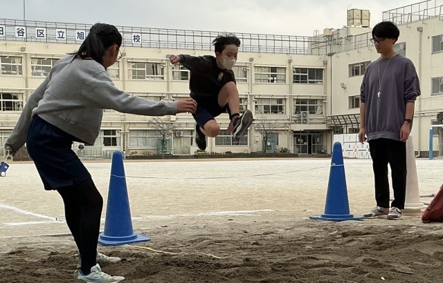 走り幅跳びの学習を進めています。工夫した場で練習を積み重ね、記録を取りました。