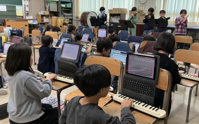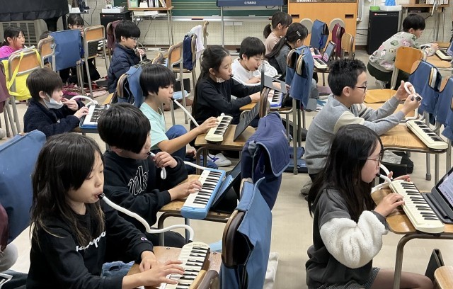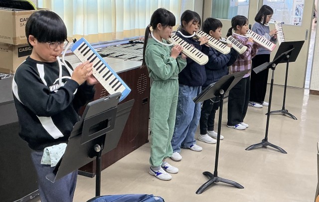 鍵盤ハーモニカで「喜びの歌」の演奏をしています。楽譜をしっかり見て繰り返し練習していました。