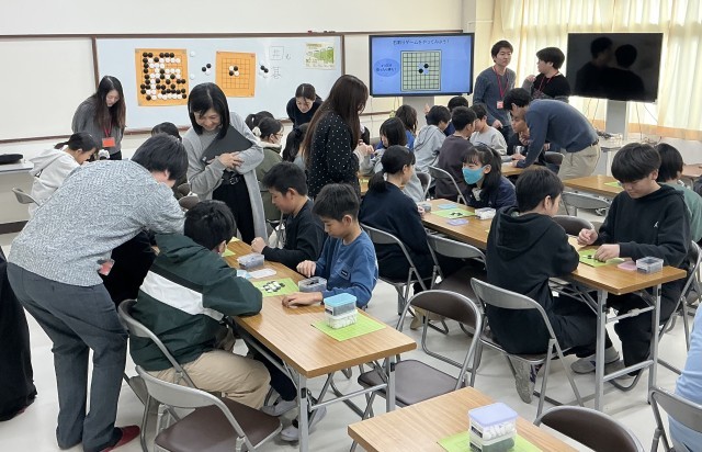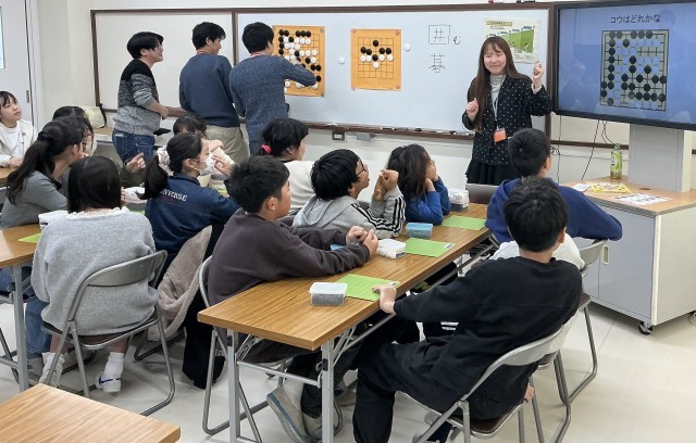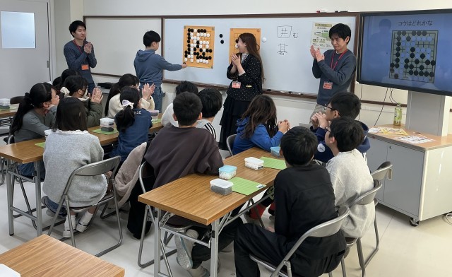 6年生 囲碁教室 公開日 2025/12/19 更新日 2025/12/19 今日のできごと 日本の伝統文化「囲碁」について学びました。マナーや約束事、打ち方など丁寧に教えていただきました。石取りゲームを楽しんでいました。