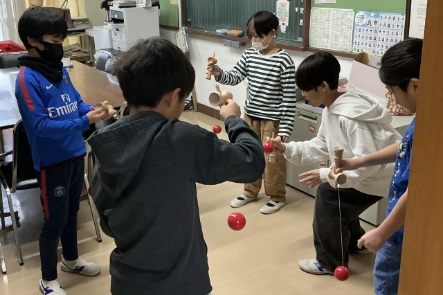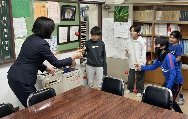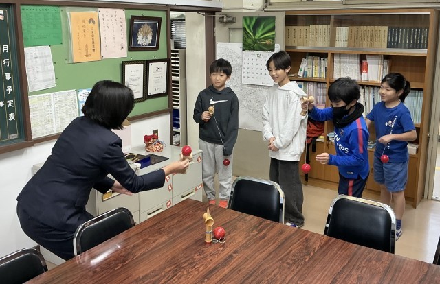 校長室で昔遊びを楽しんでいるのは、4年生の子どもたちです。校長先生の技をお手本にして、熱心に練習していました。