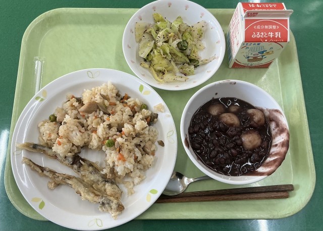 【今日の給食】とりめし・牛乳・ししゃもの天ぷら・野菜のゆかりあえ・白玉しるこ