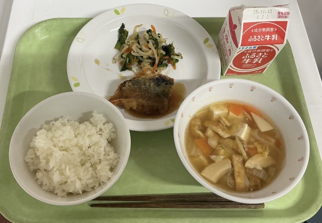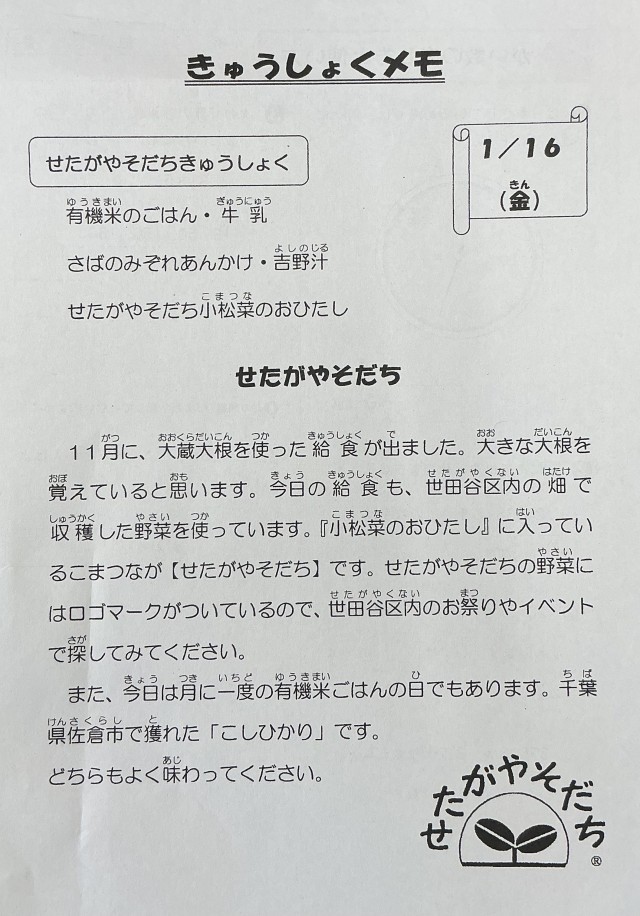 【今日の献立 せたがやそだち給食】有機米のごはん・牛乳・さばのみぞれあんかけ・吉野汁・せたがやそだち小松菜のおひたし