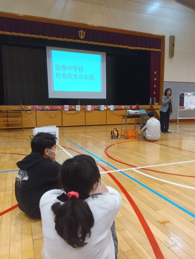 今日は、弦巻中での小中交流会です。三宿小学校、弦巻小学校、桜町小学校、旭小学校、4校の小学校の子どもたちと弦巻中学校の生徒さんとの交流です。
