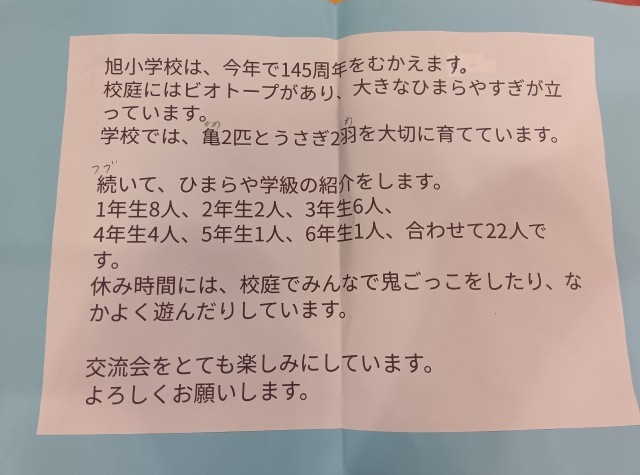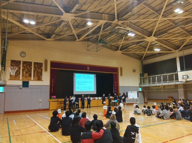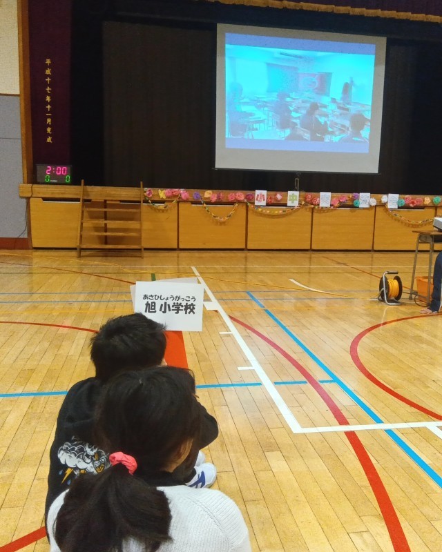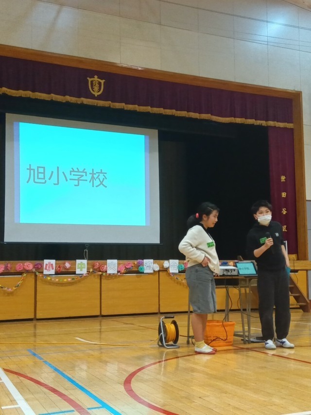 弦巻中生徒さんの挨拶や、校長先生のお話のあと、各小学校の学級紹介がありました。旭小学校の紹介では、学級のことに加え、145周年だったことも伝えました。
