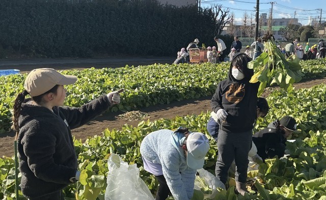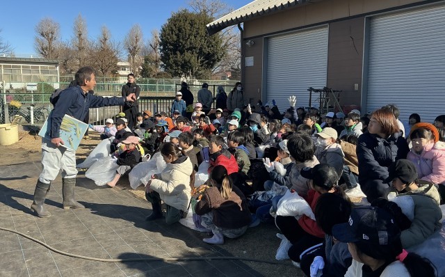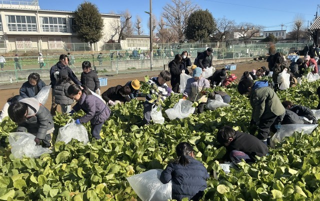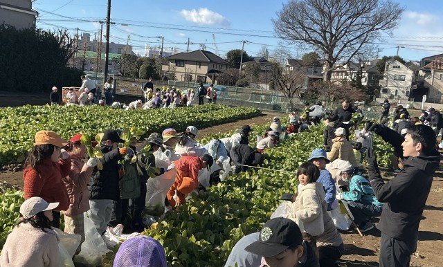 2年生 ひまらや学級 生活科 公開日 2026/01/24 更新日 2026/01/24 今日のできごと 深沢にある秋山農園に出かけ、小松菜の収穫をしました。秋山農園の方に収穫の仕方や小松菜についての解説をしていただきました。「小松菜を収穫せずに春まで待つと何色になるか?」というクイズで、春には菜の花が咲くということを聞いて、子どもたちは驚いていました。種を取って、その種を毎年植えて130年間続けているそうです。袋いっぱいの小松菜を収穫して、子どもたちは大喜びでした。 +1