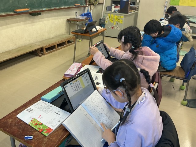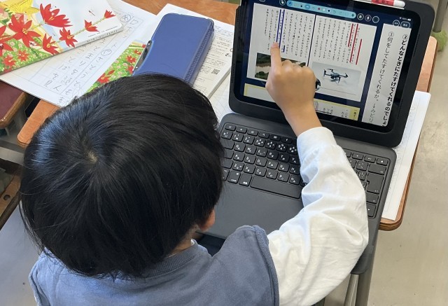 説明文「ロボット」を、大事な言葉を見つけながら読みました。タブレットを活用し、線を引きながら内容を整理していきました。