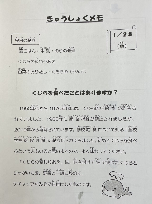 【今日の献立】麦ごはん・牛乳・のりの佃煮・くじらの変わりあえ・白菜のおひたし・くだもの(りんご)