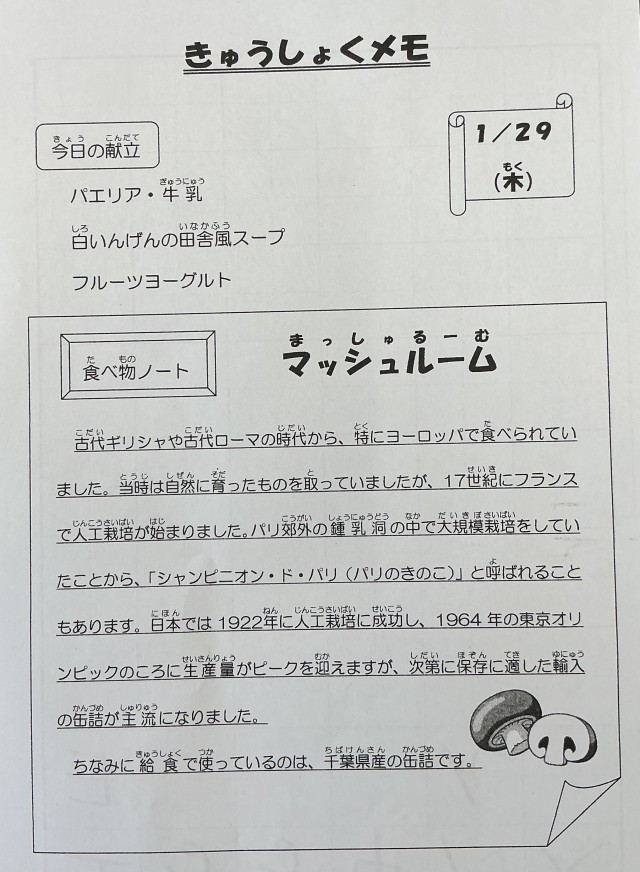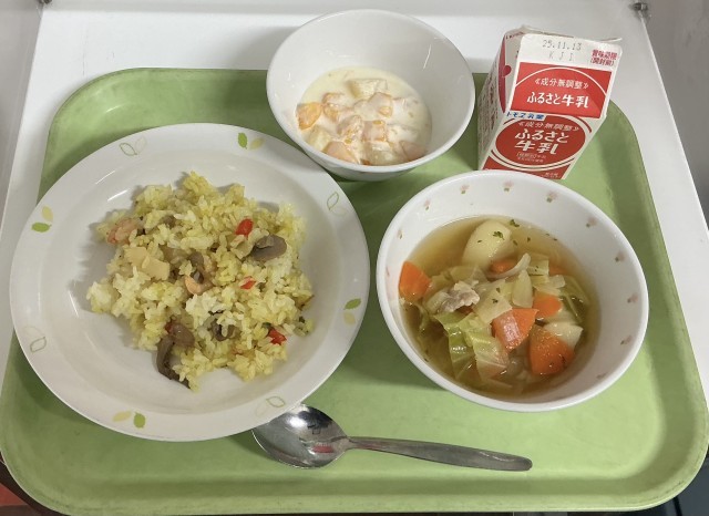 【今日の献立】パエリヤ・牛乳・白いんげんの田舎風スープ・フルーツヨーグルト