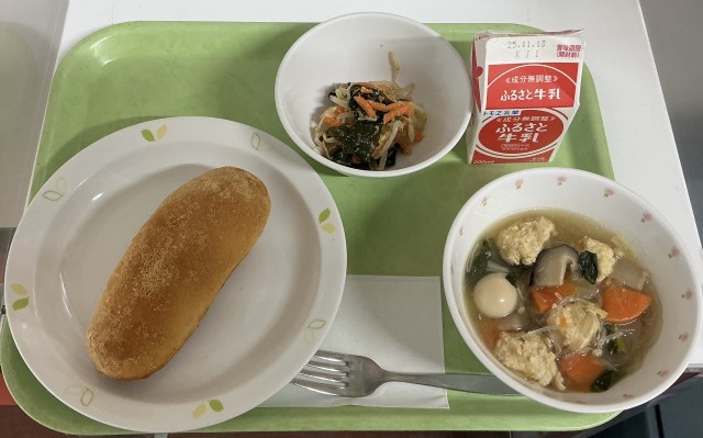 【今日の献立】きなこ揚げパン・牛乳・肉団子入り春雨スープ・わかめサラダ