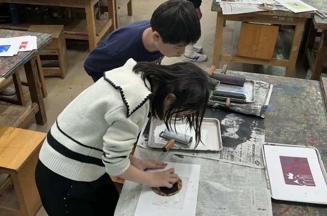 「掘り進み版画〜ほって重ねて生まれる形〜」の学習を進めています。版が重なることを意識して、刷り方、掘り方を工夫してつくっていきました。
