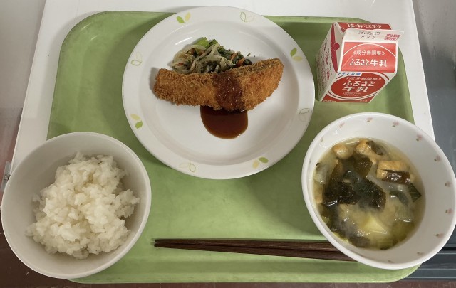 【今日の献立】有機米のごはん・牛乳・鮭フライ・野菜の磯辺あえ・有機野菜のみそ汁