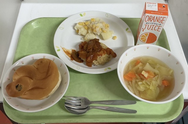 【今日の献立】ぶどうぱん・オレンジジュース・豆腐入りハンバーグ・コーンポテト・野菜スープ