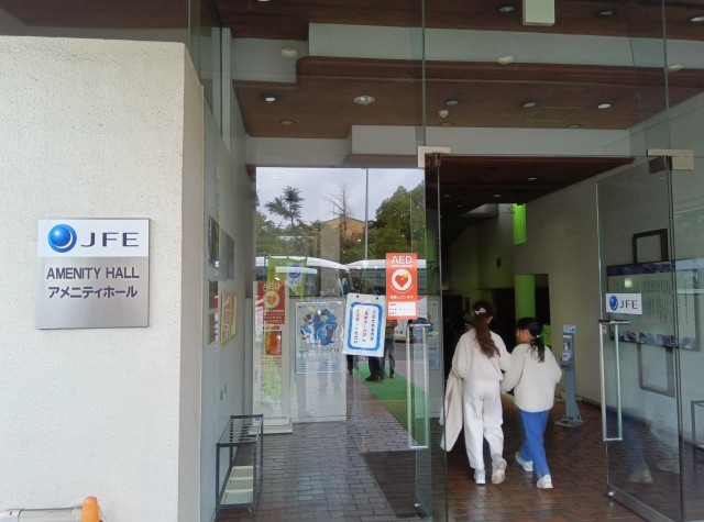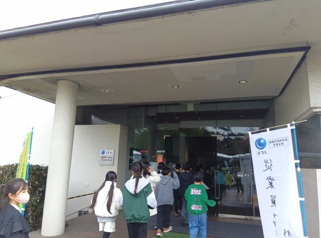 最初の見学場所はJFEスチール東日本製鉄所。広大な敷地をしばらくバスで移動し、ホールで説明や動画の視聴を受けたあと、圧延機で鋼片がうすく長くのばされていく様子を見学しました。大きな音、熱気、工場の迫力を肌で感じながら、工程をじっくり見ていました。ホールに戻り、質問したり、クイズに答えたりし、見学終了。最後に、案内してくださった方へ「ご安全に」のサインを送り、JFEスチールを後にしました。