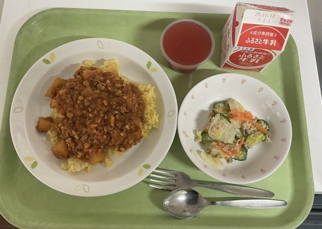 【今日の献立】チリビーンズライス・牛乳・白菜とツナのサラダ・レインボーゼリー